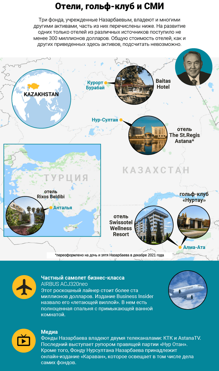 «Қозоғистон оммавий ахборот воситалари Назарбоевга қарашли хайрия жамғармаларининг кўплаб хайрли ишларини баландпарвоз сўзлар билан ёритиб келади. Бироқ, фондлар бошқа функцияни ҳам бажаради: улар миллиардлаб долларлик активларни бошқаради. Булар- умумий қиймати камида 8 миллиард доллар бўлган ҳашаматли меҳмонхоналар, банклар, заводлар, омборхоналар ва бошқа активлардир. Расмий жиҳатдан Назарбоев бу бойликларга эгалик қилмайди, лекин у фондлар асосчиси бўлгани учун уларни назорат қилади», — дейилади нашр хабарида.