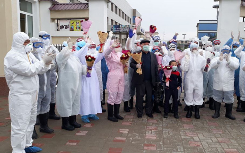 Қашқадарё вилоятининг тиббиёт ходимлари соғайган беморларни табриламоқдалар . Соғлиқни сақлаш вазирлиги матбуот хизмати фотосурати