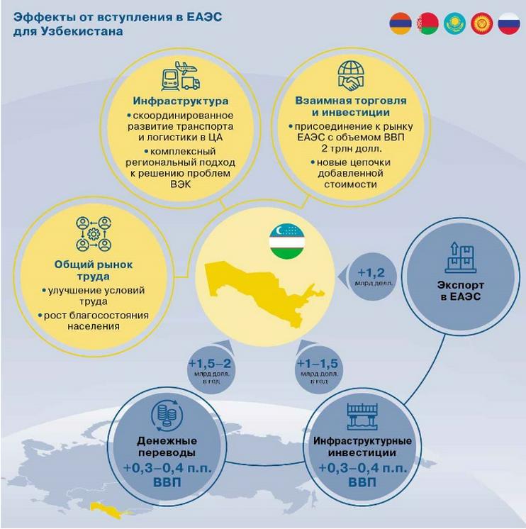 Ҳужжатда интеграциядан Ўзбекистон ва иттифоқнинг амалдаги аъзолари кўрадиган манфаатлар таҳлил қилинади. Унда ЕОИИдан Ўзбекистонга йўналтириладиган инфратузилмавий инвестицияларнинг салмоғи йилига $1–1,5 млрд миқдорида баҳоланган. Ўзбекистонга қўшимча пул ўтказмалари миқдори йилига $1,5–2 млрд ташкил этиши мумкин. Республиканинг ЕОИИга аъзо мамлакатларига экспорти йилига қўшимча $1,2 млрд (таққослаш учун ушбу кўрсатгич 2020 йили $3 млрд ташкил этган) ўсиши кутилади.
