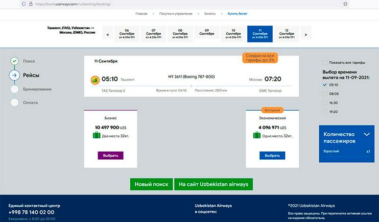 Uzbekistan Express аиачипталарини www.uzairways.com сайти, Uzbekistan Airways Sales филиалидан ёки авиакомпания агентларидан харид қилиб олиш мумкин, дейилади авиакомпания хабарида. Бироқ, сайтда сентябрь ойидан бошлаб Тошкент — Москва йўналиши бўйича авиачипталарнинг нархи 4 096 971 сўмдан ($384 ёки 28 451 рубль) бўлиши кўрсатилган. «Фарғона» машҳур агрегаторлардан ушбу йўналиш бўйича чипта топишга ҳаракат қилди. Россия авиакомпаниясининг 29 сентябрдаги авиапарвозининг минимал чипта нархи 22 708 рублдан бошланиши маълум бўлди.