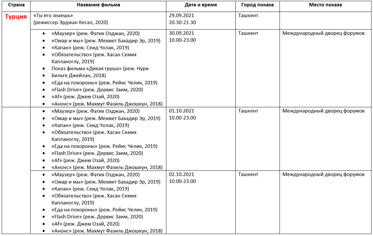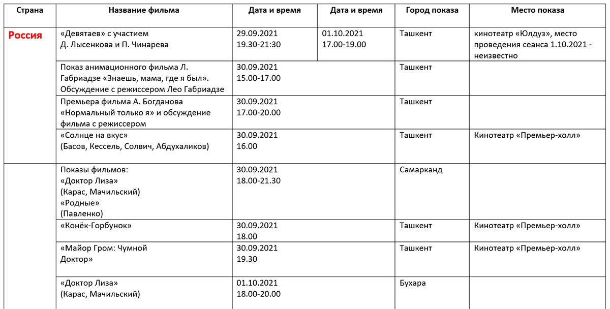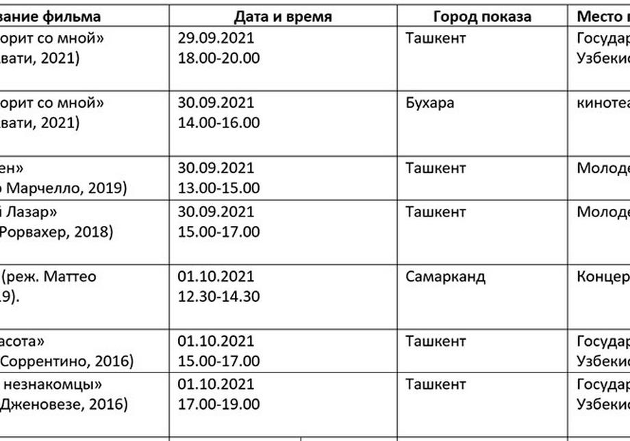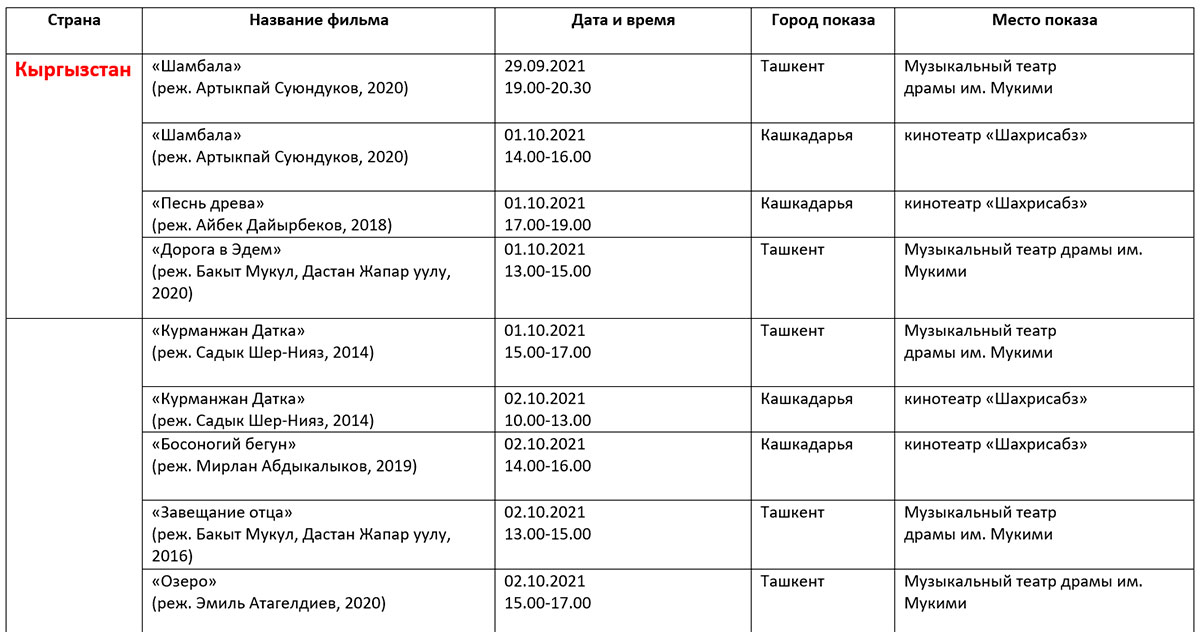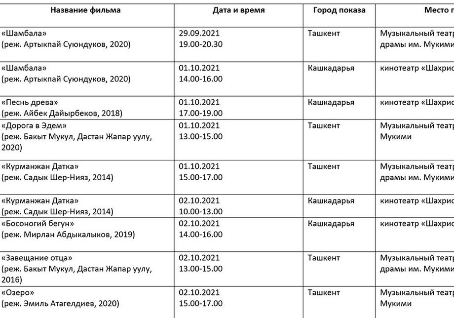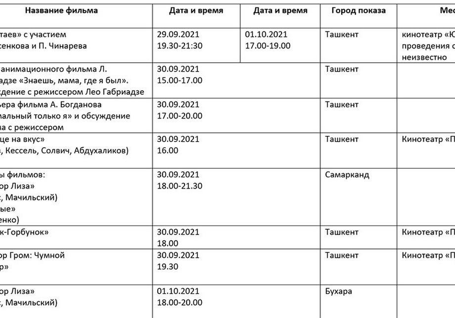 Қуйида кинофорум ташкилотчилари тақдим этган дастур билан таништирамиз. Унда Ўзбекистон ва Ҳиндистон кино кунлари берилмаган.