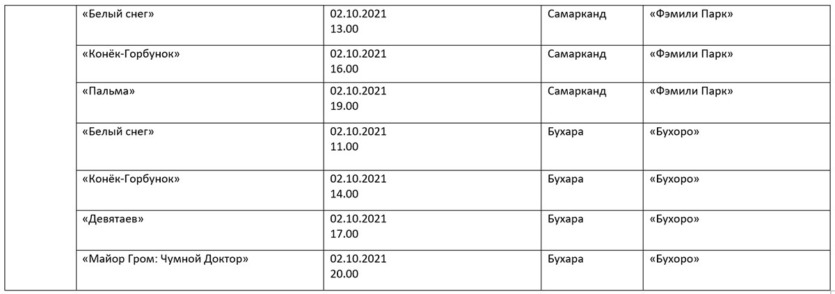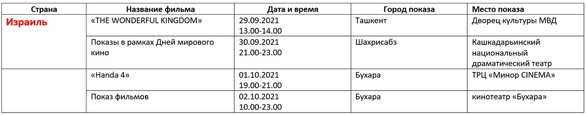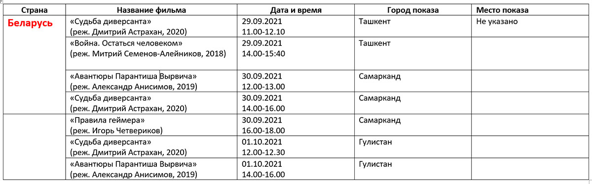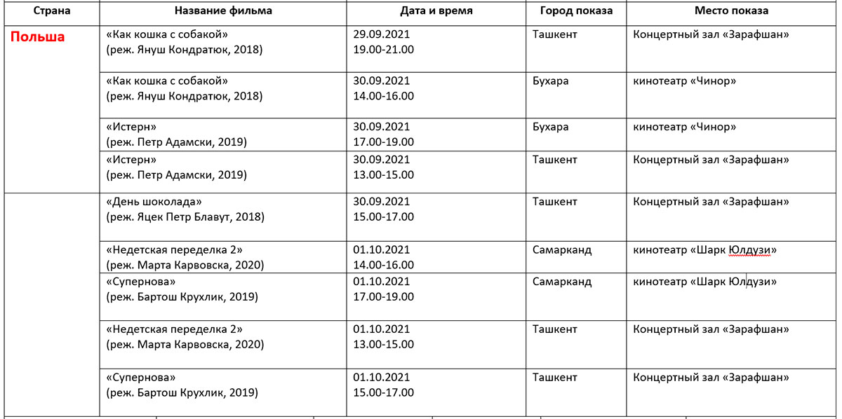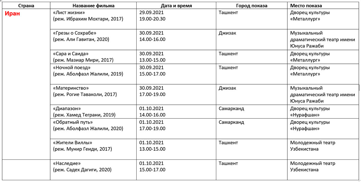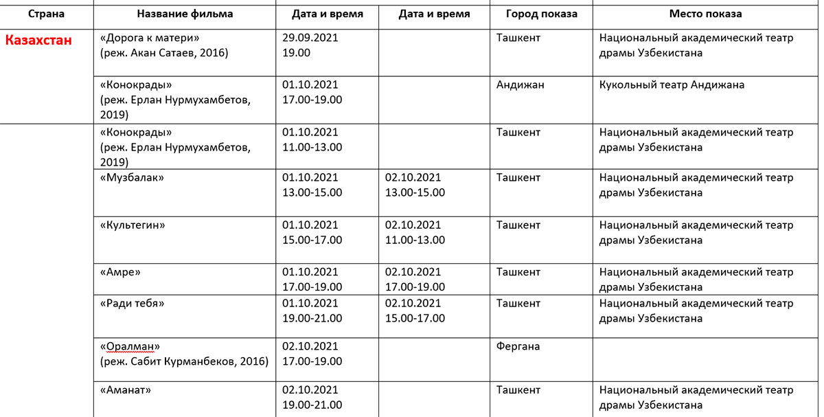 Қуйида кинофорум ташкилотчилари тақдим этган дастур билан таништирамиз. Унда Ўзбекистон ва Ҳиндистон кино кунлари берилмаган.