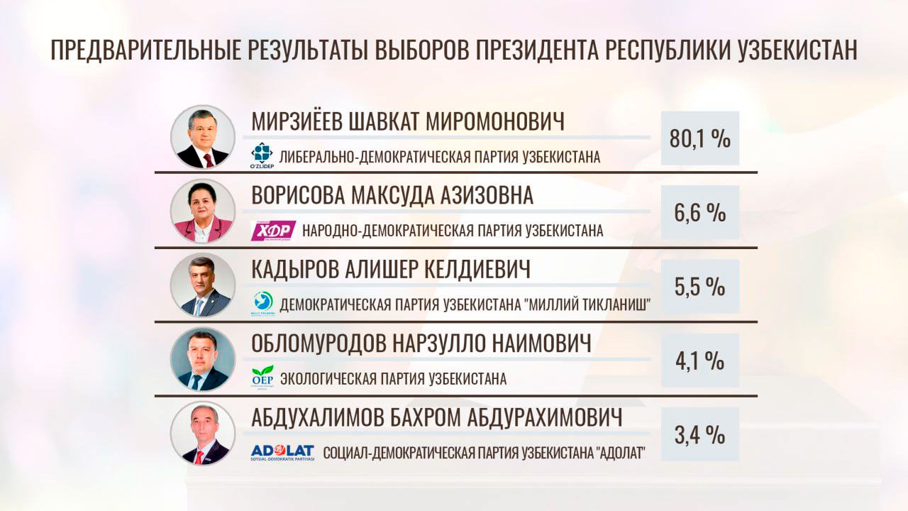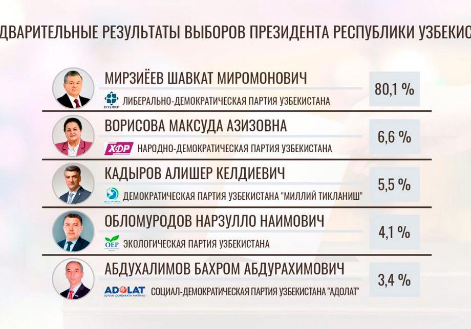 Ўзбекистоннинг амалдаги президенти Шавкат Мирзиёев 80,1% овоз билан давлат раҳбарлигига ўтказилган сайловда ғалаба қозонди. Марказий сайлов комиссияси раиси Зайниддин Низамходжаев президент сайловининг дастлабки натижаларини эълон қилди, деб хабар беради «Фарғона» мухбири.
