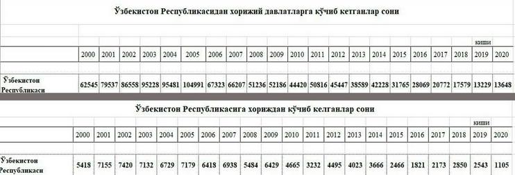 2000-2020 йиллар оралиғида 1 миллиондан ортиқ Ўзбекистонда доимий яшовчилар хорижга кўчиб кетган. Давлат статиcтика қўмитасининг Kun.uz сўровига берган жавобида мана шу ҳақда сўз боради.