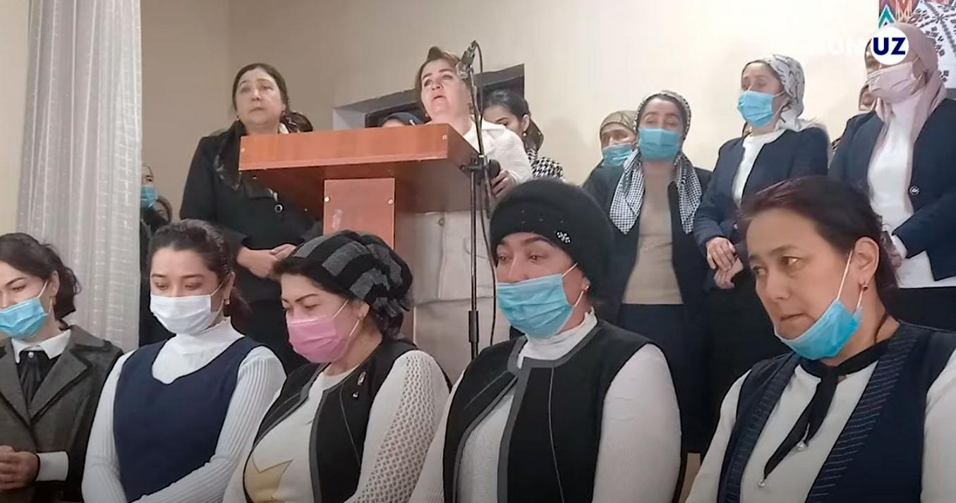 Ўқитувчиларнинг ота-оналардан узр сўраган йиғилиши 4 февраль куни бўлиб ўтган. Мактаб директори Муқаддамхон Хасанова дастлаб бундай тадбирни ўтказишга қарши бўлганини, кейин эса Мухторжон Қурбоновнинг илтимосига кўра, рози бўлганини айтган. Чунки, у рад жавоби берилган тақдирда иккаласи ҳам туман ҳокимига душман бўлиб қолишидан огоҳлантирган. Учрашув олдиндан ёзилган сценарий бўйича ўтган, узр сўраган ўқитувчиларга кўпроқ ишончли чиқиши учун «кўз ёши» тўкиш тавсия қилинган.
